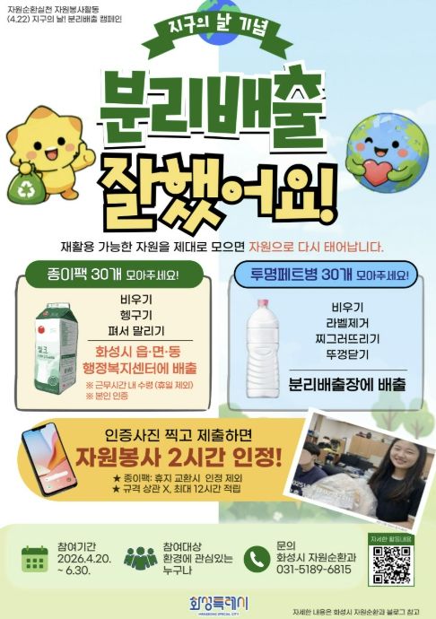 (비전21뉴스) 화성특례시가 2026년 ‘지구의 날(4월 22일)’을 맞아 시민들이 일상 속에서 환경 보호를 실천할 수 있는 자원봉사 활동 '분리배출 잘했어요' 캠페인을 운영한다고 밝혔다.