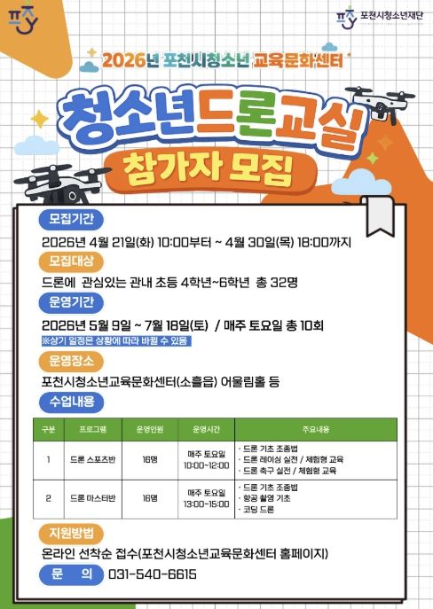 (비전21뉴스) (재)포천시청소년재단 포천시청소년교육문화센터는 오는 4월 21일부터 30일까지 관내 초등학교 4학년부터 6학년을 대상으로 청소년드론교실 1기 참가자를 선착순으로 모집한다고 밝혔다.