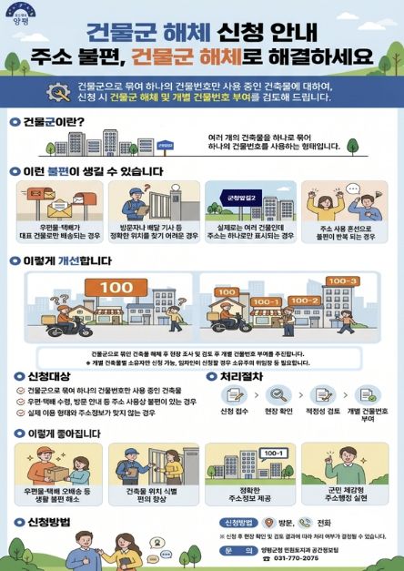 (비전21뉴스) 양평군은 건물군으로 묶여 하나의 건물번호만 사용하고 있는 건축물을 대상으로 건물군 해체 및 개별 건물번호 부여를 추진해 군민의 주소 사용 불편을 해소할 계획이라고 밝혔다. 이번 사업은 국민불편사항 개선 과제의 일환으로 추진되며, 실제 이용 형태와 맞지 않는 주소 체계를 정비해 보다 정확한 주소 사용 환경을 조성하기 위해 마련됐다.