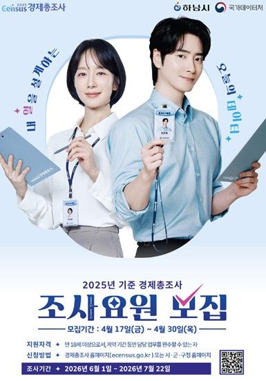 (비전21뉴스) 하남시는 4월 17일부터 30일까지 ‘2025년 기준 하남시 경제총조사’ 수행을 위한 조사요원을 모집한다고 밝혔다.