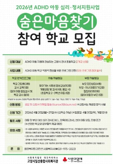 (비전21뉴스) 고양시일산종합사회복지관은 ADHD 아동의 학교 적응을 돕기 위한 심리·정서지원사업 ‘숨은마음찾기’에 참여할 학교를 모집한다고 21일 밝혔다.
