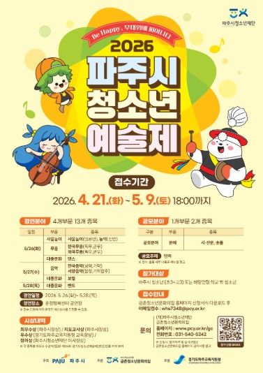 (비전21뉴스) (재)파주시청소년재단 금촌청소년문화의집은 오는 4월 21일부터 5월 9일까지 ‘2026 파주시청소년예술제’ 참가자를 모집한다고 밝혔다. 올해‘Be Happy, 무대위에 피어나다’를 부제로 개최되는 이번 예술제는 제34회 경기도청소년예술제 파주시 공식 예선으로, 파주시 청소년이라면 누구나 참가 신청이 가능하다.