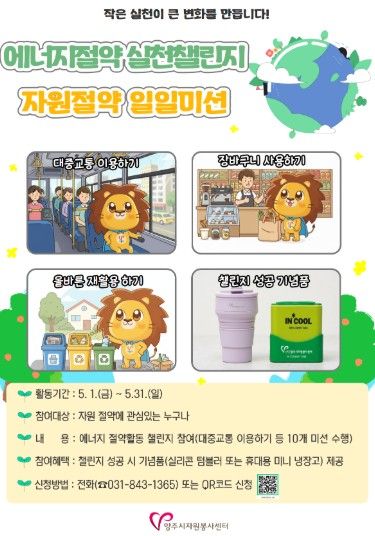 한편, 에너지 절약 실천 챌린지 ‘자원절약 일일미션’은 유선 또는 QR코드를 통해 신청받고 있으며, 참여 및 활동 관련 문의는 양주시자원봉사센터를 통해 안내받을 수 있다.