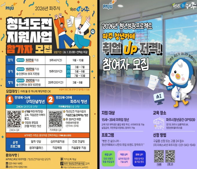 파주시가 시행하는 청년 취업지원 사업으로는 ‘청년도전지원사업’, ‘청년성장프로젝트’가 있다. ‘청년도전지원사업’은 구직단념 청년에게 맞춤형 프로그램을 제공하고 참여수당과 특전(인센티브)을 지급하는 사업으로, 사업비 659백만 원에서 89백만 원을 증액해 총 748백만 원으로 확대되어 기존 130명 지원에서 155명으로 지원을 확대한다. ‘청년성장프로젝트’사업은 미취업 청년을 대상으로 취업 역량 강화 프로그램, 지역 기업 탐방, 취업 상담 및 고용정책 연계를 제공하는 사업으로, 사업비 61백만 원에서 6.3백만 원을 증액해 총 67.3백만 원으로 확대되어 기존 336명에서 400명으로 확대 지원한다.