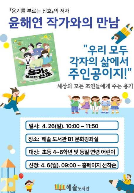 이번 행사는 해솔도서관 어린이 자료실 3~4월 전시 도서 연계 프로그램의 일환으로, 도서관 전시 도서에 대한 관심을 배가시키고, 어린이들이 직접 전시 도서의 주제(‘네 삶의 주인공이 되어줘!’)와 관련된 활동에 참여할 수 있도록 마련됐다. 특히, 윤해연 작가와 또래 친구들과 함께 그의 도서 '용기를 부르는 신호'(서유재, 2025)에 등장하는 인물들이 내는 서로 다른 용기를 들여다보며 주인공이란 특별한 능력을 지닌 사람이 아닌, 용기를 내고 한 걸음씩 나아가는 사람이라는 것을 깨닫게 되는 시간이 될 것으로 기대된다.
