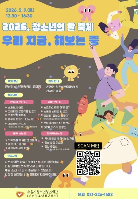 (비전21뉴스) 수원시청소년청년재단 권선청소년청년센터가 오는 5월 9일, 청소년이 주인공이 되어 직접 경험하고 도전하는 참여형 축제 ‘지금우리, 해보는중’을 개최한다고 밝혔다.