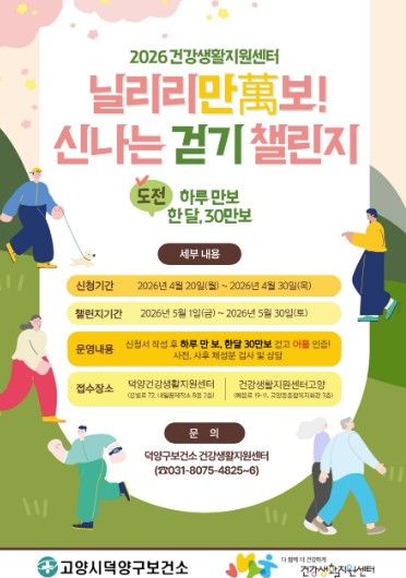 (비전21뉴스) 고양특례시 덕양구보건소 건강생활지원센터는 지역주민의 건강생활 실천 확산을 위한 생활밀착형 걷기 프로그램 ‘2026 닐리리만보 걷기 챌린지’를 오는 5월부터 운영을 시작한다.