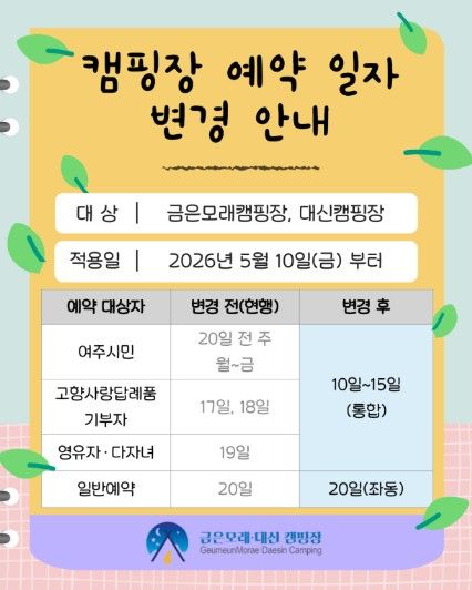 (비전21뉴스) 여주도시공사는 오는 5월 10일부터 이용자 중심의 고품질 서비스 제공을 위해 금은모래캠핑장, 대신캠핑장의 온라인 통합예약 일정을 대폭 간소화한다고 밝혔다.