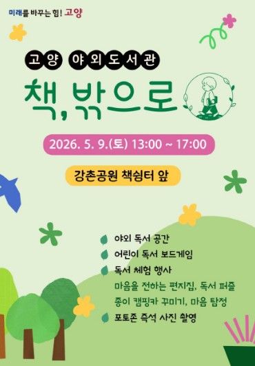 (비전21뉴스) 고양특례시는 오는 5월 9일 오후 1시부터 5시까지 일산동구 강촌공원 책쉼터 앞에서 고양 야외도서관 ‘책, 밖으로’를 운영한다.
