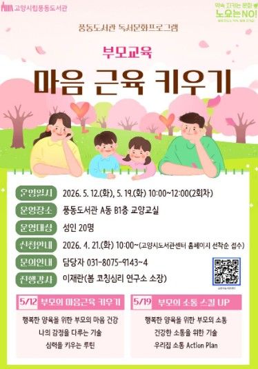 (비전21뉴스) 고양특례시 풍동도서관은 오는 5월 독서문화 프로그램 ‘부모교육, 마음 근육 키우기’를 진행한다고 22일 밝혔다.
