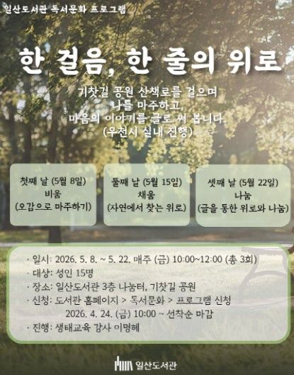 일산도서관 관계자는 “‘한 걸음, 한 줄의 위로’는 자연 속에서 천천히 걷고 글로 자신을 표현하는 과정을 통해 스스로를 돌보고 치유하는 프로그램”이라며, “참여자들이 서로의 이야기를 나누며 공감과 위로를 경험하는 시간이 되길 바란다”고 전했다.