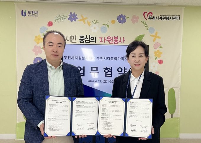 (비전21뉴스) 부천시다문화가족지원센터는 4월 21일 부천시자원봉사센터와 자원봉사 활성화 및 다문화가족의 지역사회 참여 확대를 위한 업무협약(MOU)을 체결했다고 밝혔다.