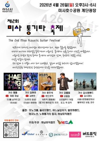 (비전21뉴스) 하남시 지역 예술인들이 참여하는 '제2회 미사통기타축제'가 오는 4월 26일 오후 3시부터 미사호수공원 계단광장에서 개최된다.