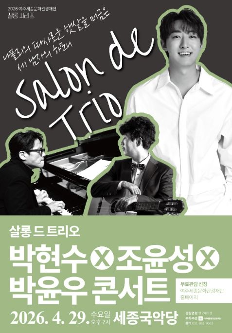 (비전21뉴스) 여주세종문화관광재단이 오는 29일, 문화가 있는 날을 맞아 2026년 특별기획 살롱 시리즈의 세 번째 무대 '살롱 드 트리오 박현수X조윤성X박윤우 콘서트'를 세종국악당에서 개최한다.