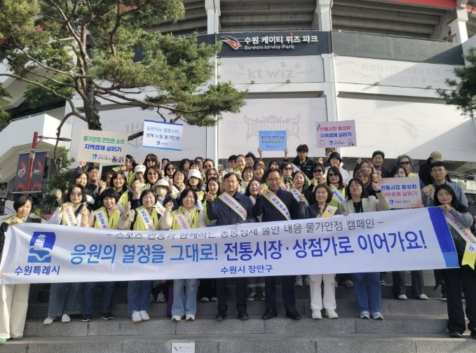 (비전21뉴스) 수원시 장안구는 지난 22일, 수원KT위즈파크 일대에서 야구관중을 대상으로 지역경제 활성화를 위한 캠페인을 추진했다. 이번 캠페인에는 장안구청장을 비롯해 관계 공무원과 물가모니터요원 등 20여 명이 참여했다.