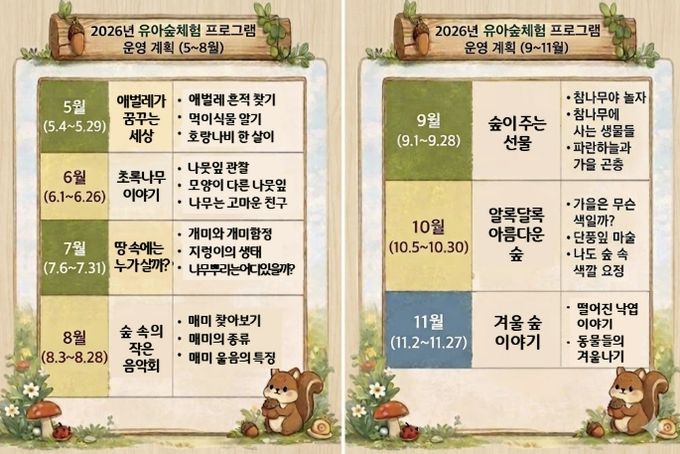 아울러 시는 올해 평일 단체 프로그램 외에도 가족 단위 시민이 참여할 수 있는 주말 프로그램을 새롭게 개설해 시범 운영할 예정이다. 이를 통해 아이들이 부모와 함께 숲에서 자연을 체험할 수 있는 기회를 확대해 나갈 계획이다.