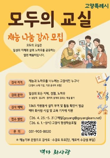 고양시 관계자는 “백마 화사랑 모두의 교실은 시민 한 사람 한 사람의 재능이 소중한 배움으로 연결되는 사업”이라며 “많은 시민들이 강사로 참여해 배움과 나눔이 살아 있는 평생학습도시 고양을 함께 만들어가길 바란다”고 말했다.