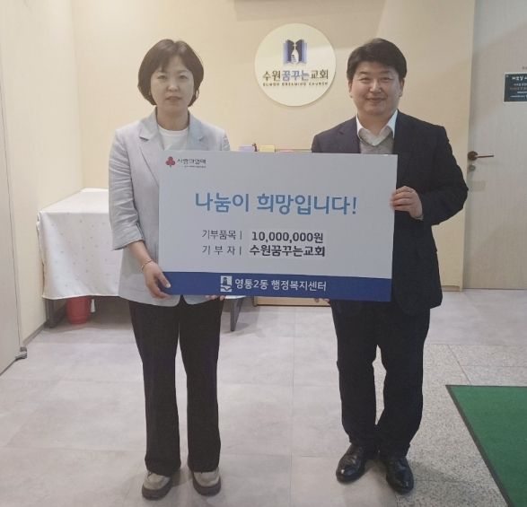 마혜란 영통2동장은 “매년 후원해 주신 성금으로 관내 취약계층 이웃들에게 다양한 지원을 해드렸는데 올해 역시 교인들의 뜻에 따라 뜻깊게 사용하겠다”며, “지역사회를 위해 꾸준히 나눔과 사랑을 실천해 주시는 수원꿈꾸는교회에 깊이 감사드린다”고 말했다.
