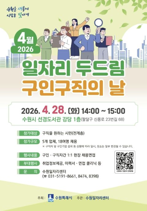 (비전21뉴스) 수원특례시는 4월 28일 오후 2시부터 3시까지 선경도서관 강당에서 ‘4월 일자리 두드림 구인·구직의 날’을 개최한다.