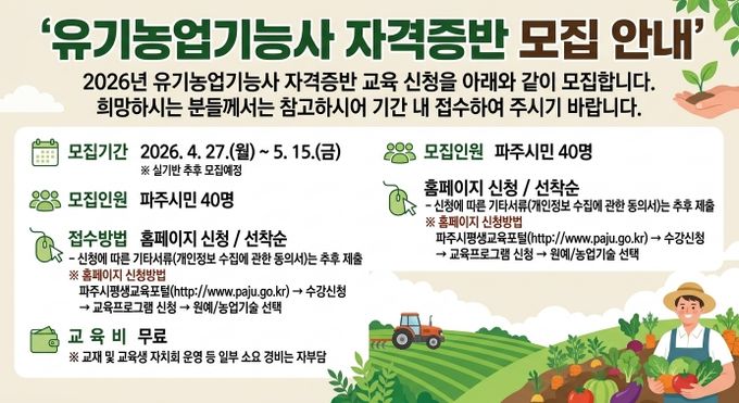 (비전21뉴스) 파주시농업기술센터는 친환경농업 분야 농업 전문 인력 육성을 위한 '2026년 유기농업기능사 자격증 취득’교육생을 4월 27일부터 5월 15일까지 모집한다.