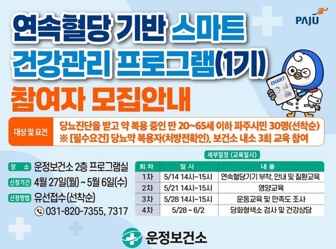 (비전21뉴스) 파주시 운정보건소는 심뇌혈관질환 예방관리사업의 일환으로 ‘연속혈당 기반 스마트 건강관리 프로그램’참여자를 오는 27일부터 10일간 모집한다.