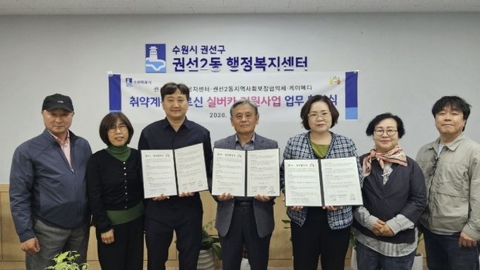 (비전21뉴스) 수원시 권선구 권선2동은 지난 23일, 권선2동 지역사회보장협의체, 케이메디와 취약계층 어르신의 안전한 이동 지원과 삶의 질 향상을 위한 “실버카(보행보조기) 지원사업 업무협약(MOU)”을 체결했다.