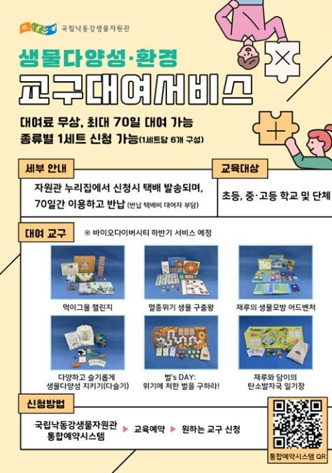 (비전21뉴스) 기후에너지환경부 산하 국립낙동강생물자원관은 학교 및 교육기관을 대상으로 4월 27일부터 ‘교구 대여 서비스’와 ‘온라인 생물·환경 교실’ 참여 신청을 받는다고 밝혔다.