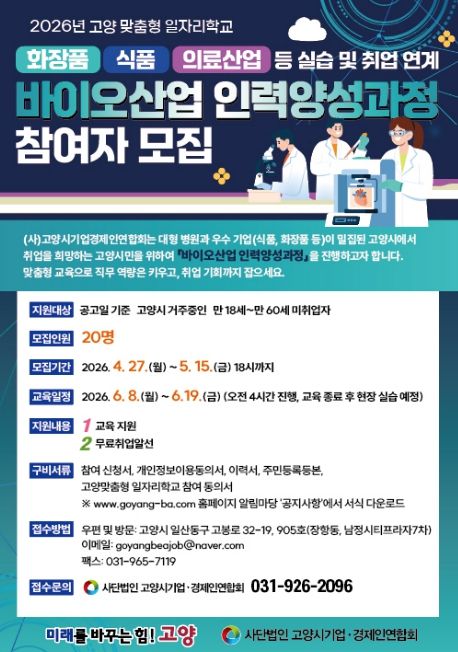 (비전21뉴스) 고양특례시는 2026년 고양맞춤형 일자리학교 공모사업 중 ‘바이오산업 인력 양성과정’의 참여자를 모집한다.