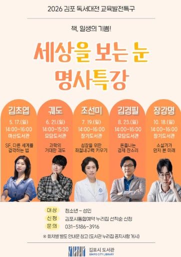 (비전21뉴스) 김포시 도서관은 2026 김포 독서대전 교육발전특구 사업으로 '세상을 보는 눈, 명사특강'을 오는 5월 17일부터 10월 18일까지 5회에 걸쳐 관내 도서관 3곳에서 진행한다.
