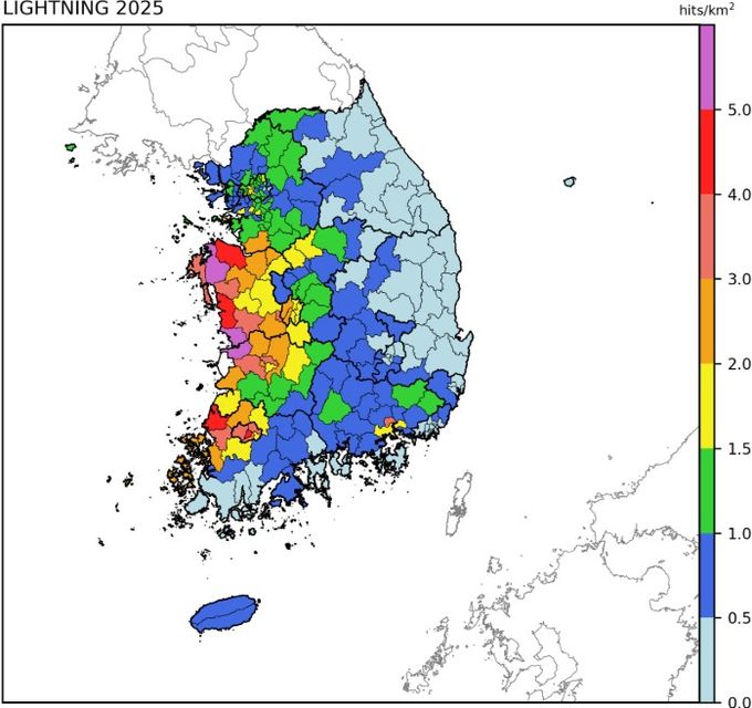 (비전21뉴스) 기상청은 2025년 우리나라에서 관측된 낙뢰 정보를 담은 ‘2025 낙뢰연보’를 발간했다. 연보는 기상청 21개 낙뢰 관측망으로 관측한 자료를 통해 분석한 △월별, 광역시·도별, 시군구별 낙뢰 횟수 △단위 면적당(㎢) 횟수 △낙뢰 공간 분포 △주요 5대 낙뢰 사례 등의 내용을 담고 있다.