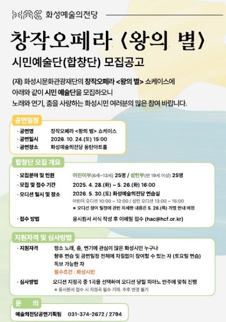(비전21뉴스) (재)화성시문화관광재단은 오는 10월 개최 예정인 창작오페라 '왕의 별' 쇼케이스 무대에 참여할 시민합창단을 모집한다.