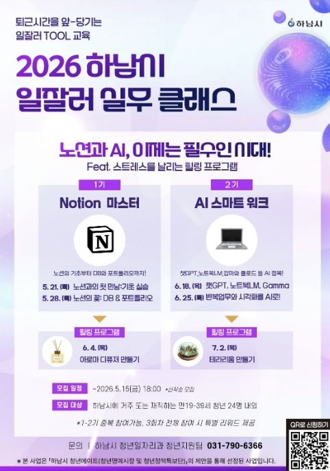 교육은 원도심, 미사, 감일·위례 등 3개 권역에서 평일 야간에 운영돼 직장인 청년도 부담 없이 참여할 수 있다. 총 5개 기수로 진행되며 기수별 20명 내외를 모집하며 실무 교육을 거쳐 마지막 회차에는 업무 고민과 스트레스를 공유하는 교류 프로그램을 마련해 지역 청년 간 자연스러운 네트워크 형성도 지원할 계획이다.