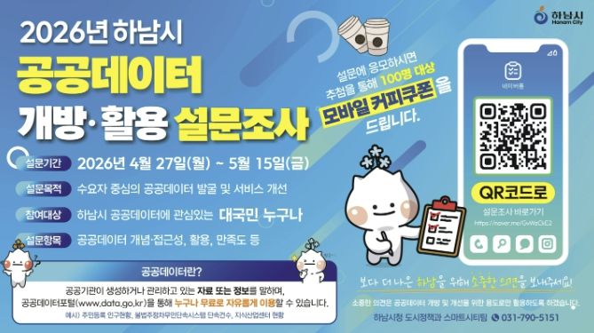 (비전21뉴스) 하남시는 시민과 기업, 연구기관 등 다양한 수요자의 의견을 반영해 공공데이터 개방 및 활용을 확대하고자 ‘2026년 하남시 공공데이터 설문조사’를 실시한다고 밝혔다.