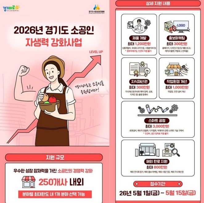 참여를 희망하는 소공인은 오는 5월 1일부터 5월 15일 오후 6시까지 ‘경기바로’누리집을 통해 온라인으로 신청하면 된다. 심사는 정량·정성 평가를 거쳐 60점 이상 고득점순으로 선정될 예정이며, 선정 결과는 6월 중 개별 통보된다.
