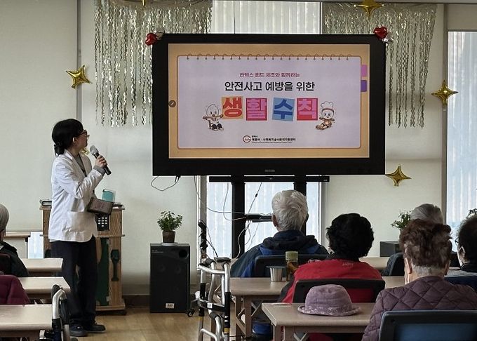이번 교육은 일상생활에서 발생할 수 있는 안전사고 예방을 주제로, 기본 생활 수칙 안내와 함께 인공지능(AI) 트로트 음악에 맞춘 라텍스 밴드 생활 체조 활동으로 구성됐다. 참여자들은 음악에 맞춰 체조를 따라 하며 자연스럽게 신체활동에 참여하고, 퀴즈를 통해 교육 내용을 쉽고 재미있게 익히고 있다.