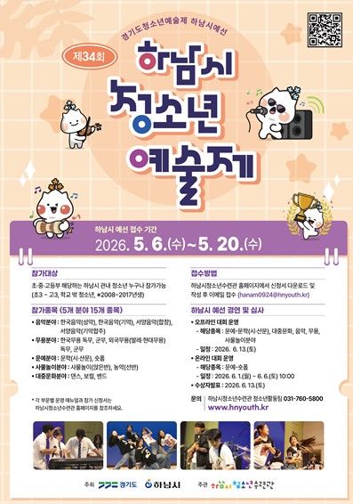 (비전21뉴스) 하남시가 주최하고 하남시청소년수련관이 주관하는 ‘2026 제34회 하남시청소년예술제’가 오는 6월 13일 하남시청소년수련관에서 개최된다.