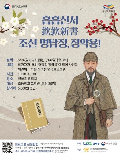 (비전21뉴스) 남양주시는 오는 5월 24일과 31일, 6월 14일 정약용 유적지에서 초등학교 고학년을 대상으로 참여형 연극 프로그램 ‘흠흠신서: 조선 명탐정, 정약용!’ 참가자를 모집한다고 밝혔다.