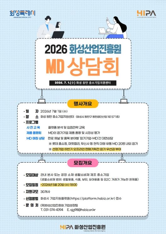 (비전21뉴스) 화성산업진흥원(원장 전병선)은 화성시 생활소비재 기업의 대형 유통망 진입과 신규 판매채널 확보를 지원하기 위해 ‘2026년 화성산업진흥원 MD 상담회’를 개최하고, 오는 5월 20일까지 참여기업을 모집한다.