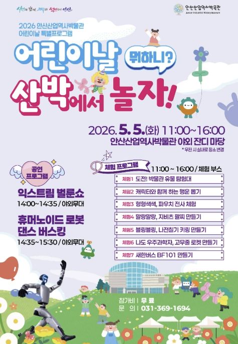 (비전21뉴스) 안산시는 내달 5일 어린이날을 맞아 안산산업역사박물관에서 어린이날 특별프로그램 ‘어린이날 뭐하니? 산박에서 놀자!’를 개최한다고 29일 밝혔다.
