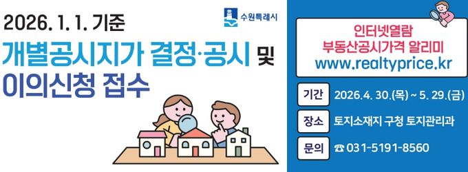 (비전21뉴스) 수원시 영통구는 2026년 1월 1일 기준 개별공시지가를 4월 30일 결정·공시하고, 5월 29일까지 이의신청 기간을 운영한다.