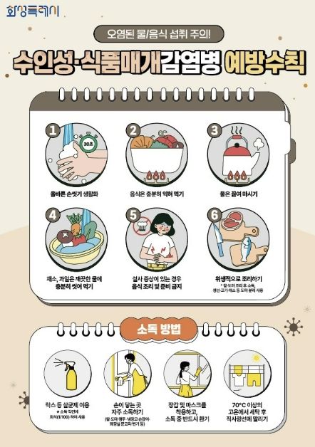 주요 예방수칙은 ▲흐르는 물에 비누로 30초 이상 손 씻기 ▲음식은 충분히 익혀 먹기 ▲물은 끓여 마시기 ▲채소와 과일은 깨끗이 씻어 섭취하기 ▲설사 증상 시 음식 조리 금지 ▲조리기구 구분 사용 등이다.