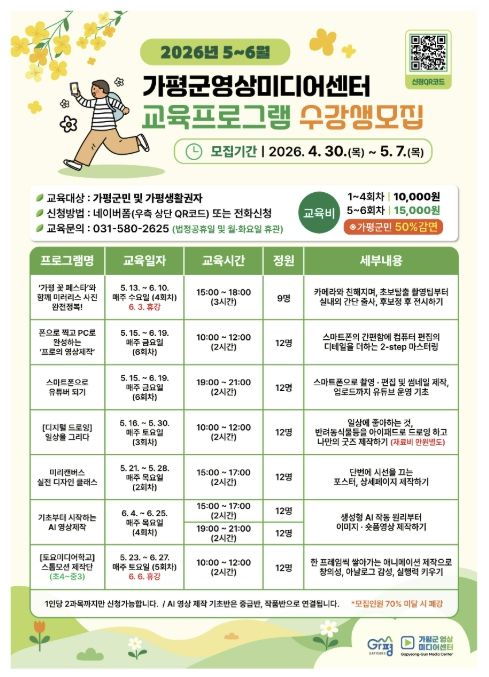 주요 프로그램은 총 7개 과정이다. △‘가평 꽃 페스타’와 함께 미러리스 사진 완전정복! △폰으로 찍고 PC로 완성하는 프로의 영상제작 △스마트폰으로 유튜버 되기 △[디지털 드로잉] 일상을 그리다 △미리캔버스 실전 디자인 클래스 △기초부터 시작하는 AI 영상제작(오후/야간) △[토요미디어학교] 스톱모션 제작단 등이다.