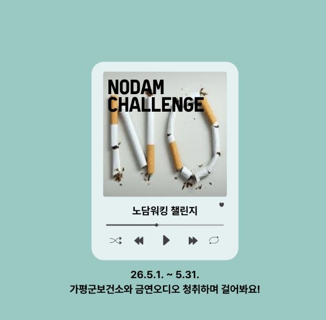 (비전21뉴스) 가평군보건소가 ‘세계 금연의 날’을 앞두고 5월 1일부터 한 달간 금연 인식 확산을 위한 ‘노담워킹 챌린지’를 진행한다. 이번 행사는 일상 속 걷기 실천과 금연 홍보를 병행해 군민들의 건강한 생활 습관 형성을 돕고자 마련됐다.
