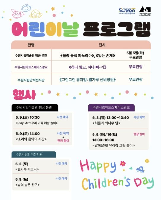수원시립미술관 남기민 관장은 “어린이날을 맞아 다양한 전시와 프로그램을 통해 미술관의 문턱을 낮추고 다채로운 체험과 추억을 만드는 시간이 되길 바란다”라고 밝혔다.