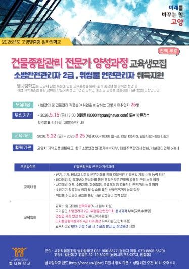 (비전21뉴스) 고양특례시는 중장년과 청년 미취업자의 재취업을 지원하는 2026년 고양맞춤형 일자리학교의 일환으로, ‘건물종합관리 전문가 양성과정’에 참여할 교육생을 모집한다고 29일 밝혔다.
