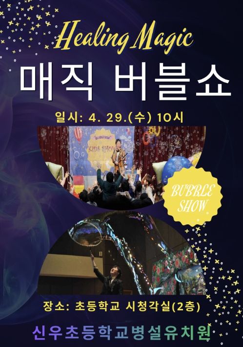 (비전21뉴스) 신우초등학교병설유치원은 4월 29일 교내 시청각실에서 ‘힐링 매직버블쇼’ 공연을 개최했다고 밝혔다. 이번 공연은 유아들이 직접 참여하며 즐길 수 있는 체험형 프로그램으로 마련됐다.
