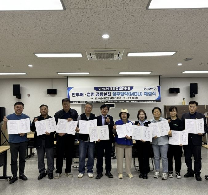 이날 협약식에는 매화동 행정복지센터와 10개 관계단체가 참여했으며, 청렴한 지역사회를 구현하고 민관 협력을 기반으로 청렴 분위기를 확산하기 위해 마련됐다.