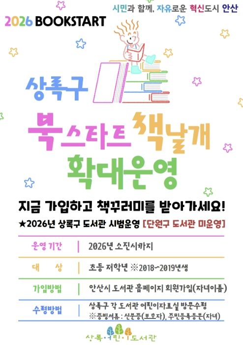 신청 방법은 안산시에 주민등록이 된 자녀의 주민등록등본과 보호자 신분증을 지참해 가까운 상록구 소재 도서관을 방문하면 된다. 시는 준비한 물량이 소진될 때까지 상록구 도서관 어린이자료실 운영시간에 맞춰 ‘북스타트’ 회원가입을 받고 책꾸러미를 배부할 예정이다.
