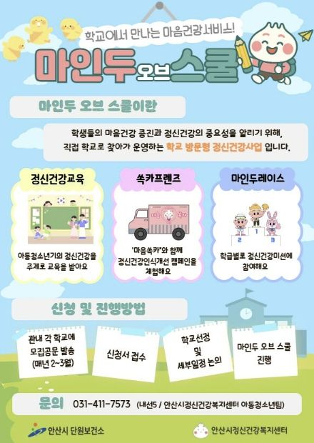 (비전21뉴스) 안산시 정신건강복지센터는 11월까지 관내 초·중·고등학교 총 10개교를 대상으로 학교로 찾아가는 정신건강사업 ‘마인두 오브 스쿨’을 운영한다고 30일 밝혔다.