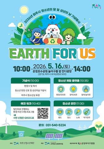 (비전21뉴스) 파주시청소년재단 교하청소년문화의집에서는 청소년의 건강한 성장과 성년의 의미를 되새기기 위해 2026년 5월 16일 '청소년의 달 및 성년의 날 기념행사 ‘EARTH FOR US’'를 개최한다.